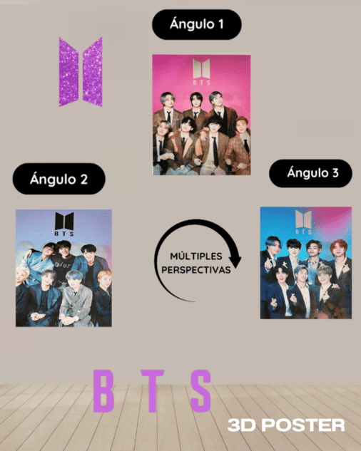 Este póster 3D transforma la imagen según tu perspectiva, creando un efecto visual envolvente que da vida a cada miembro. Un diseño moderno, perfecto para tu espacio y pensado para ARMYs que quieren sentir la energía de BTS todos los días.