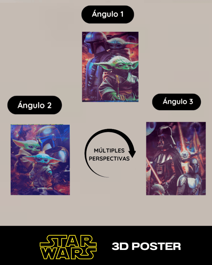 El 3D POSTER- THE MANDALORIAN | STAR WARS: tiene 3 imágenes de serie de Star Wars las aventuras del Mandaloriano Din DJarin y su inseparable amigo Groku